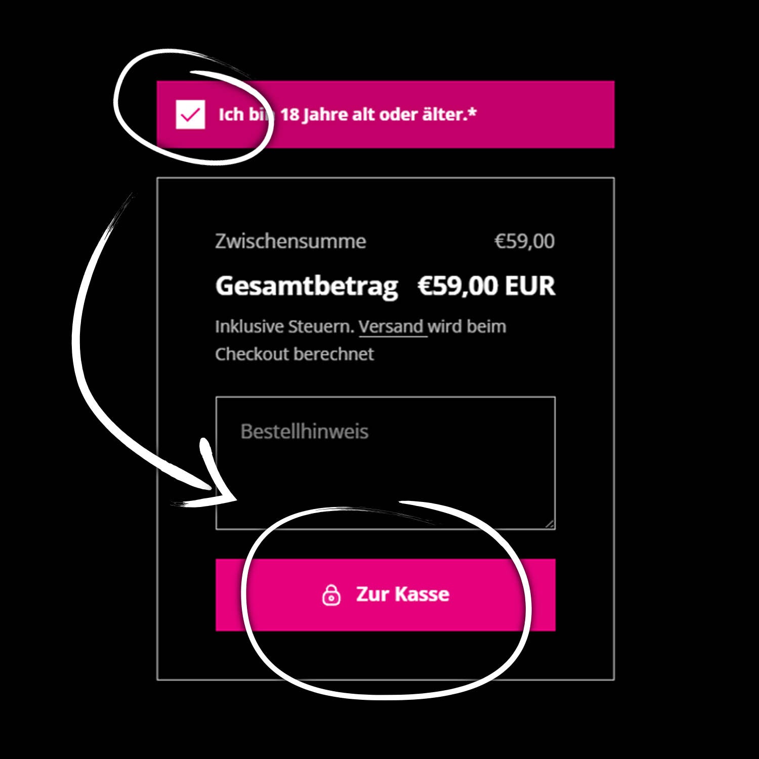 Bestätige im Warenkorb, dass du 18 Jahre oder älter bist.