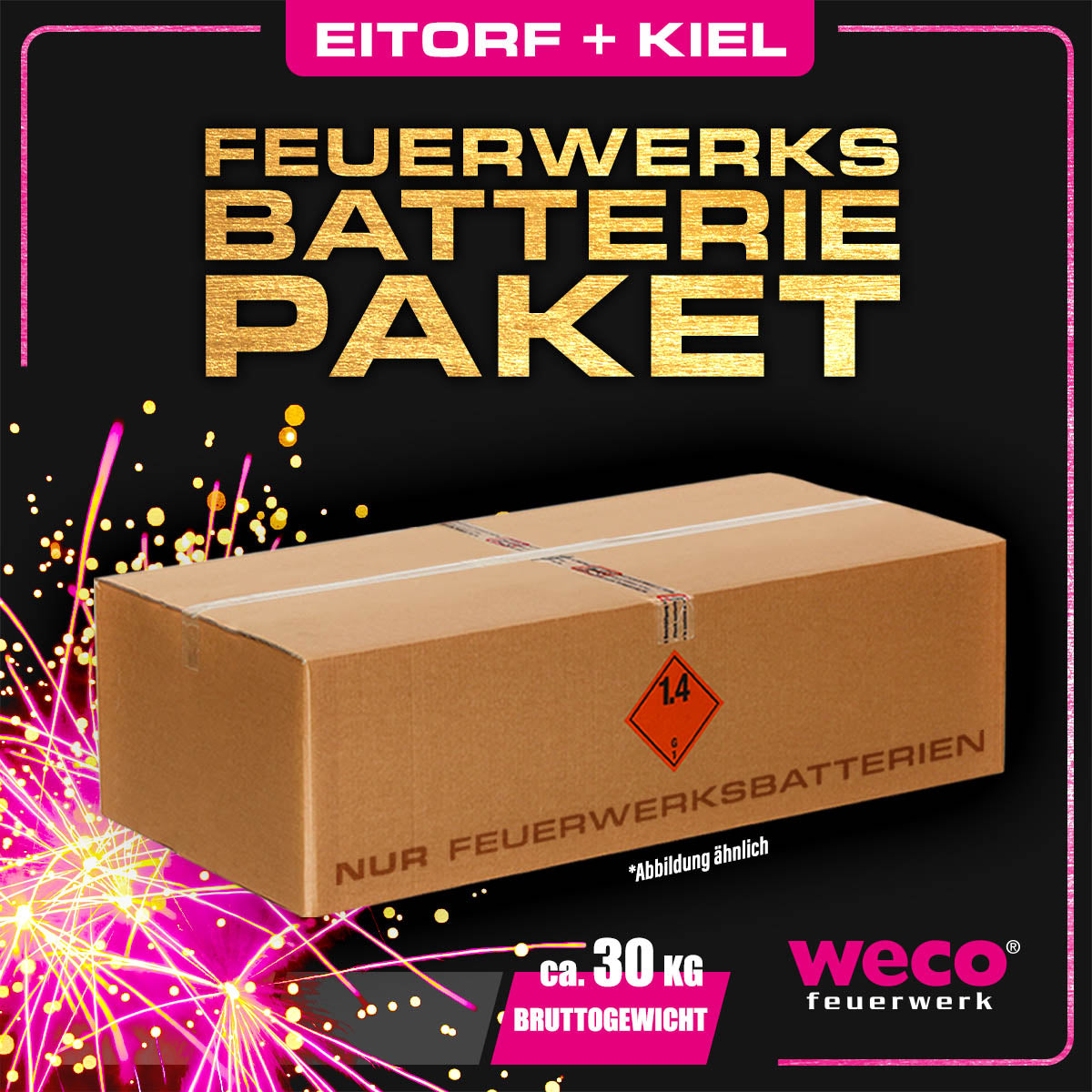 Bitte wähle die Anzahl, den Abholstandort und ein verfügbares Zeitfenster aus und lege dein Produkt in den Warenkorb. Der Warenkorb ist auf 50kg Bruttogewicht limitiert, da wir dir gesetzlich vorgegeben nicht mehr Feuerwerk in dein Fahrzeug verladen dürfen.