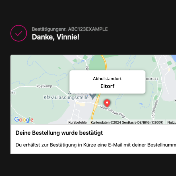 Nach deinem Kauf erhältst du eine E-Mail mit deiner Bestellbestätigung. Kurz darauf bekommst du eine weitere E-Mail mit deiner Abholbescheinigung mit dem QR-Code.